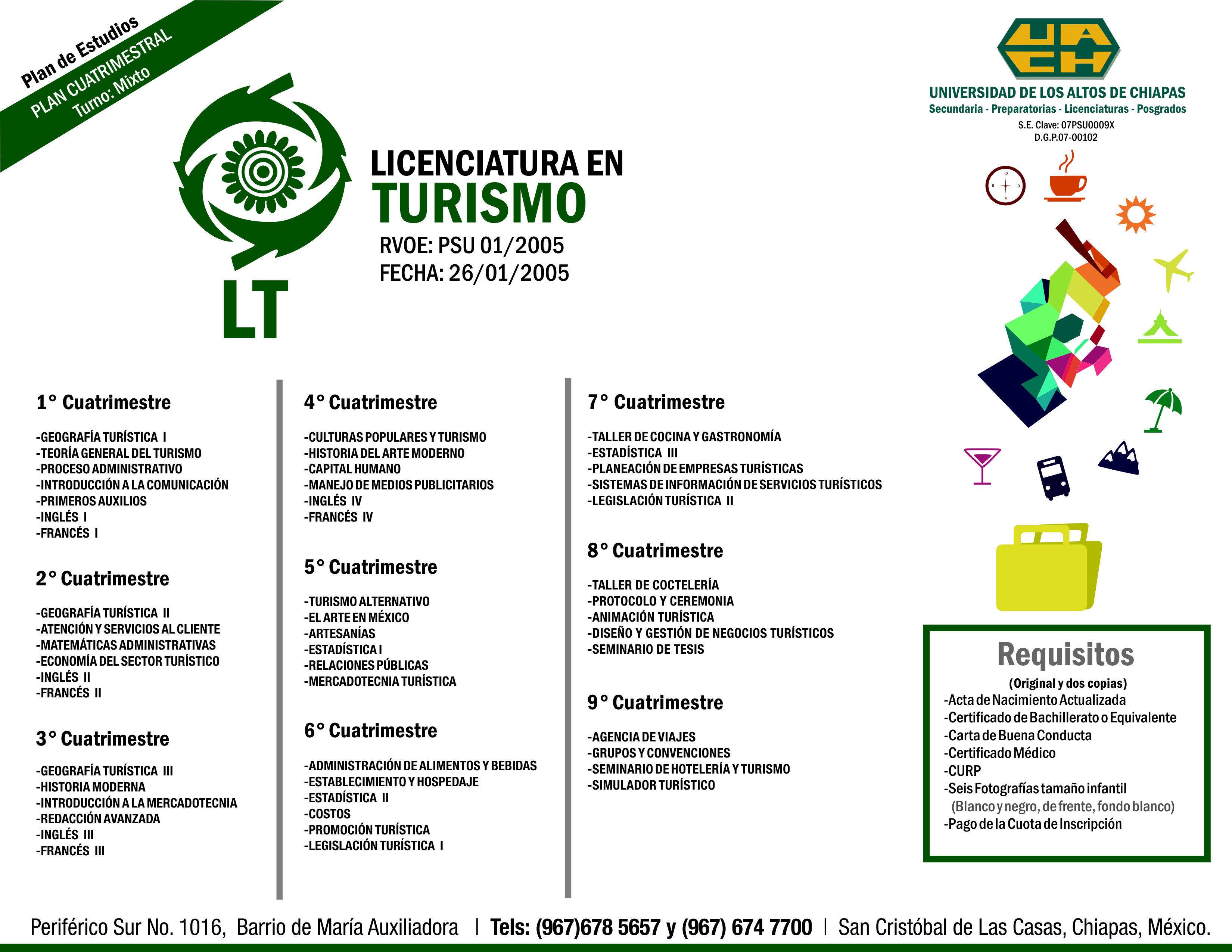 La formación en Turismo prepara profesionales capaces de cubrir las necesidades de comercialización, planeación, y relaciones públicas, además de participar en el desarrollo turístico del Estado y del País. Los egresados podrán dirigir proyectos de infraestructura turística, promoviendo el beneficio ecológico, social y económico; mejorando la imagen del país a nivel internacional. Las áreas de trabajo incluyen promoción turística, hotelería, agencias de viajes, alimentos y bebidas, artesanías, cultura regional, y diseño de nuevos proyectos turísticos.