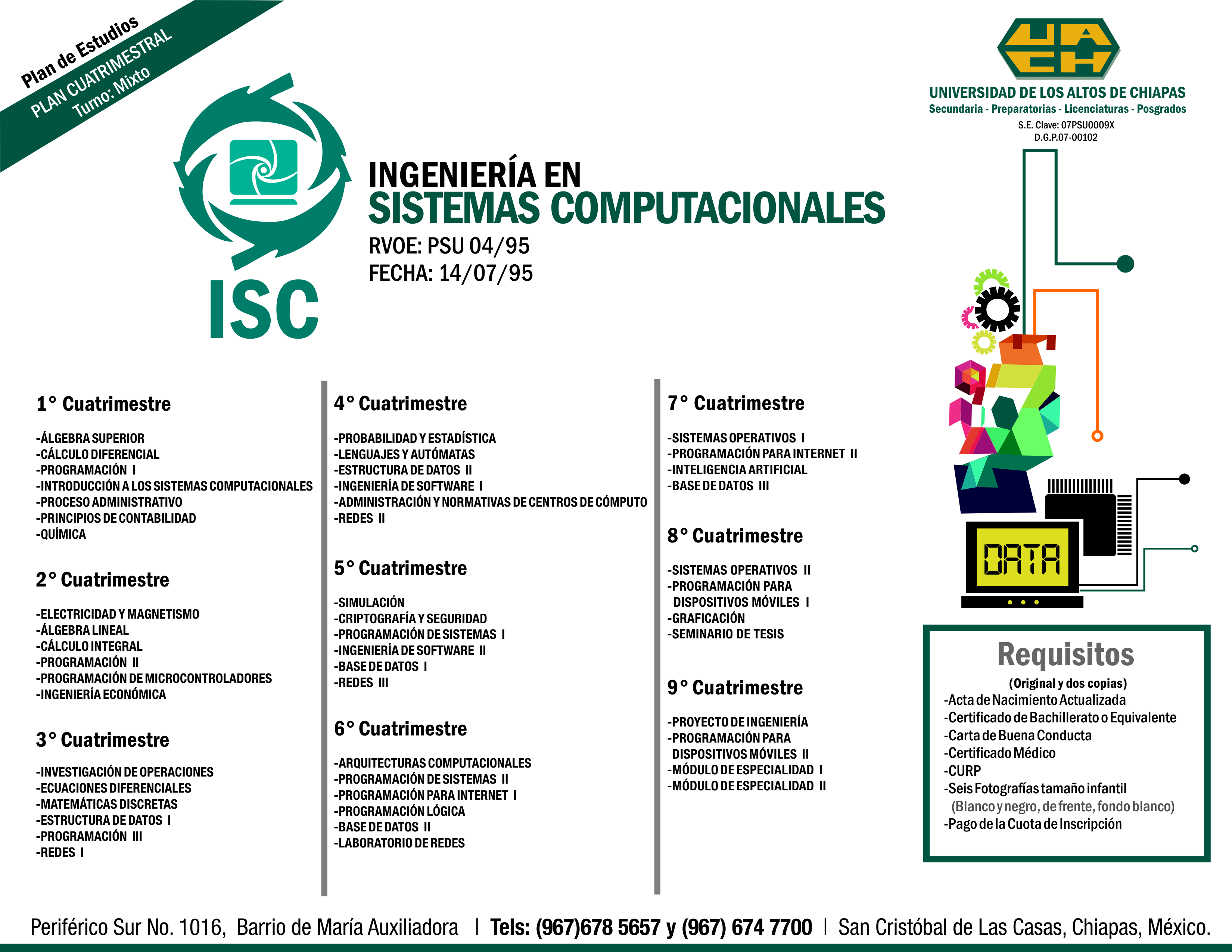 La Licenciatura en Ingeniería en Sistemas Computacionales tiene como objetivo formar profesionales altamente capacitados para diseñar, desarrollar, implementar y gestionar soluciones tecnológicas en el ámbito de la informática y las telecomunicaciones. A través de una sólida formación en áreas clave como programación, bases de datos, inteligencia artificial y redes. Serán capaces de resolver problemas complejos y adaptarse a los constantes avances tecnológicos. Podrán liderar proyectos de tecnología de la información, optimizando proceso.