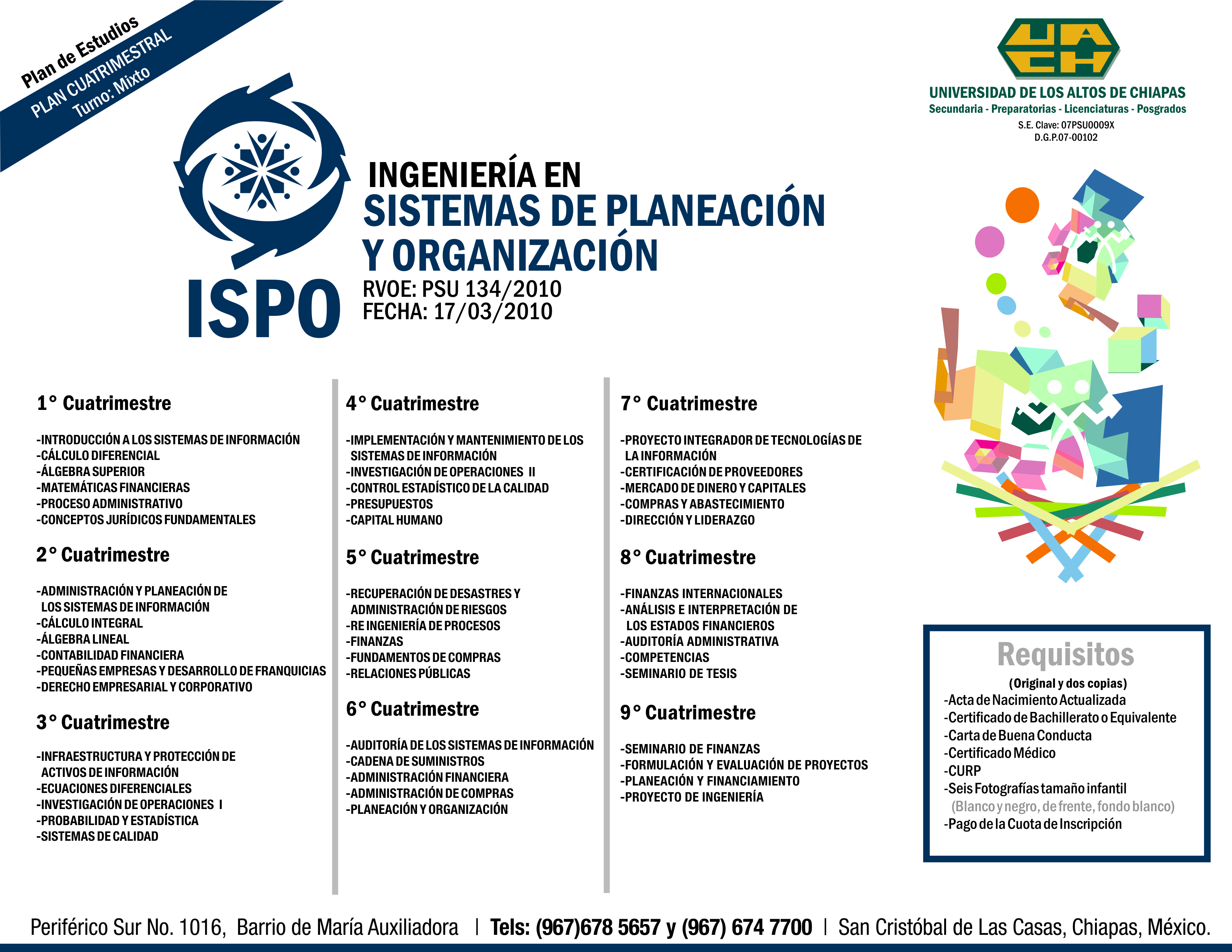 La licenciatura en Ingeniería en Sistemas de Planeación y Organización tiene como objetivo formar profesionistas capaces de administrar y optimizar sistemas de información en las organizaciones, diseñando estrategias efectivas que mejoren la productividad y competitividad en el ámbito empresarial. Estarán preparados para liderar procesos administrativos, financieros y de calidad, así como para desarrollar soluciones tecnológicas innovadoras que impulsen el crecimiento de pequeñas y grandes empresas.